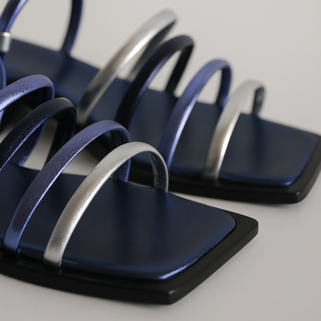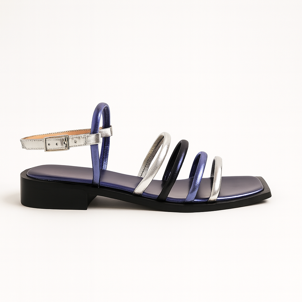 Minimalista, moderna y llena de brillo: esta sandalia es el equilibrio perfecto entre elegancia y diseño contemporáneo. Con una combinación única de tiras metálicas en plata y azul noche, aporta un toque sofisticado y versátil que realza cualquier look —desde un jean recto hasta un vestido de verano.