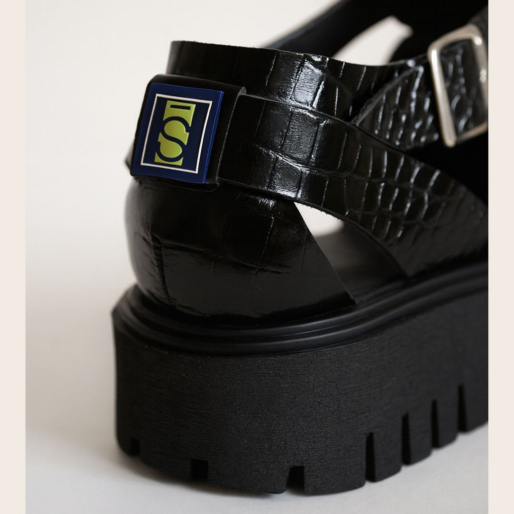 Nuestra sandalia cerrada Black Croco combina la fuerza del diseño robusto con el brillo sofisticado del cuero texturado tipo croco. Su base chunky con suela dentada brinda altura, estabilidad y una pisada firme, mientras que la tira con hebilla metálica asegura un calce cómodo y ajustable.