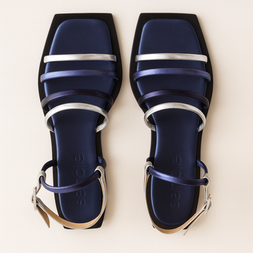 Minimalista, moderna y llena de brillo: esta sandalia es el equilibrio perfecto entre elegancia y diseño contemporáneo. Con una combinación única de tiras metálicas en plata y azul noche, aporta un toque sofisticado y versátil que realza cualquier look —desde un jean recto hasta un vestido de verano.