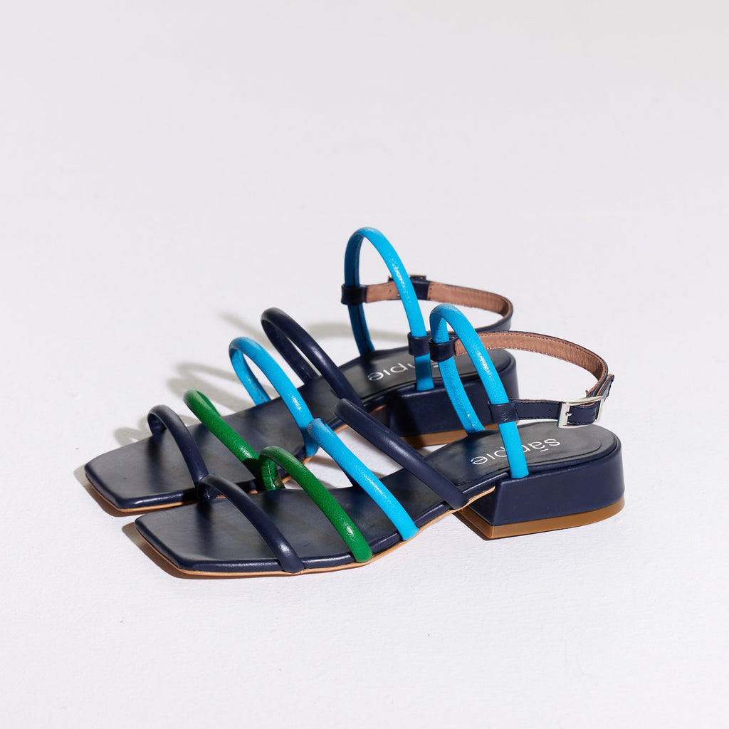 Minimalista y moderna: esta sandalia es el equilibrio perfecto entre elegancia y diseño contemporáneo. Con una combinación única de tiras zules y verdes, aporta un toque sofisticado y versátil que realza cualquier look —desde un jean recto hasta un vestido de verano.